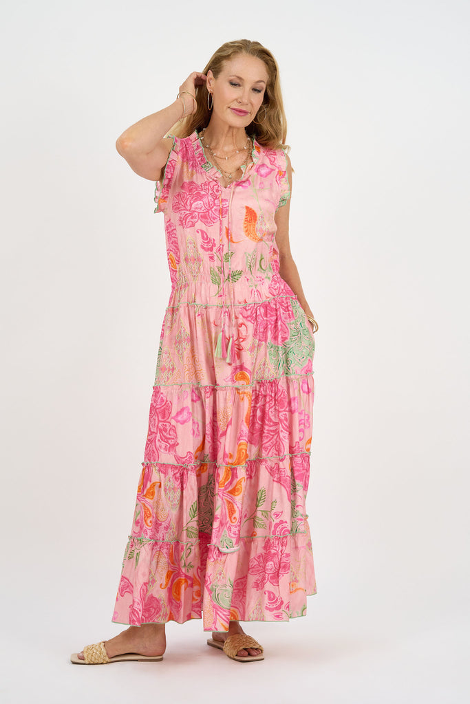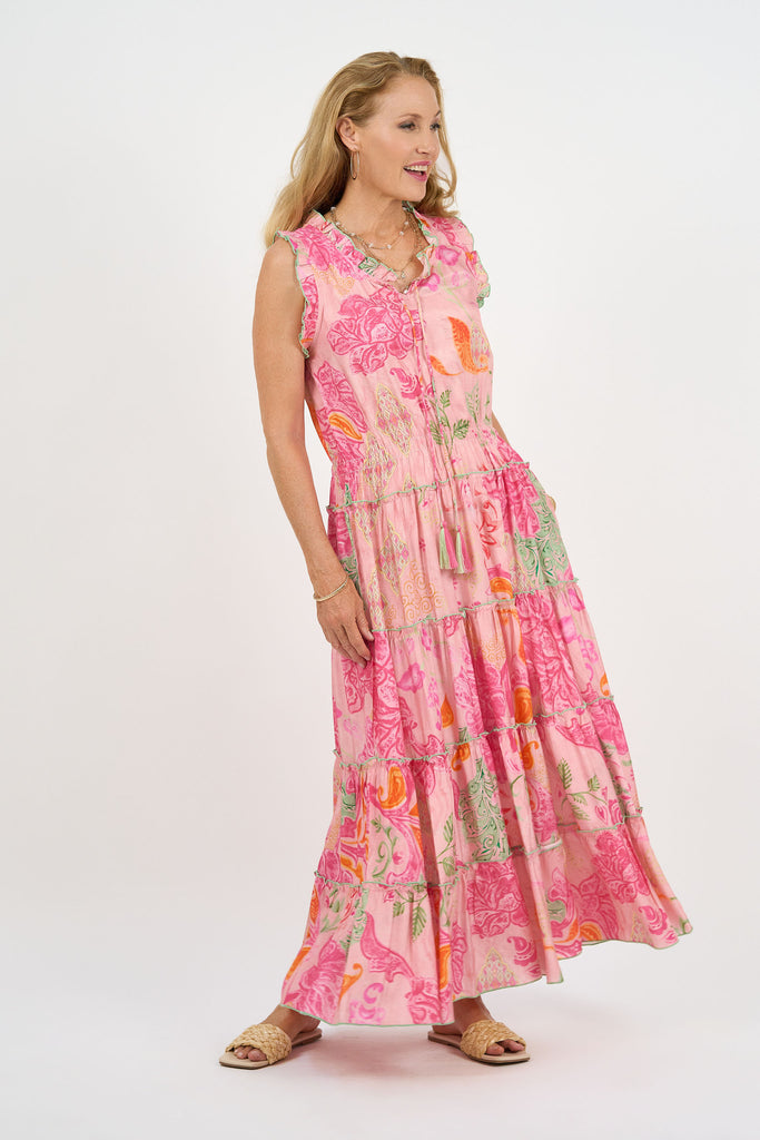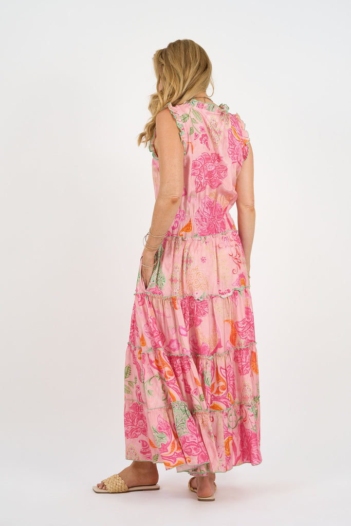 Make a statement with the Sophia Maxi Charlise, featuring a lively pink base adorned with intricate, vibrant florals. Its tiered, flowing silhouette and soft, lightweight fabric ensure comfort and graceful movement all day long. Playful ruffled edge at the neckline and arm add an artisanal touch to this sleeveless maxi. Perfect for brunches, celebrations, or holidays, this maxi radiates effortless elegance and joyful spirit.