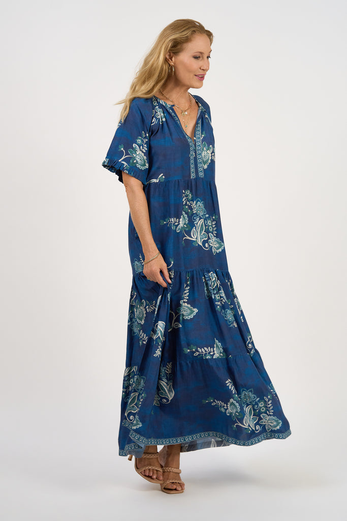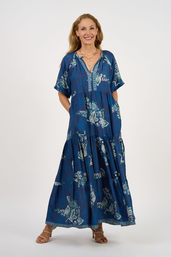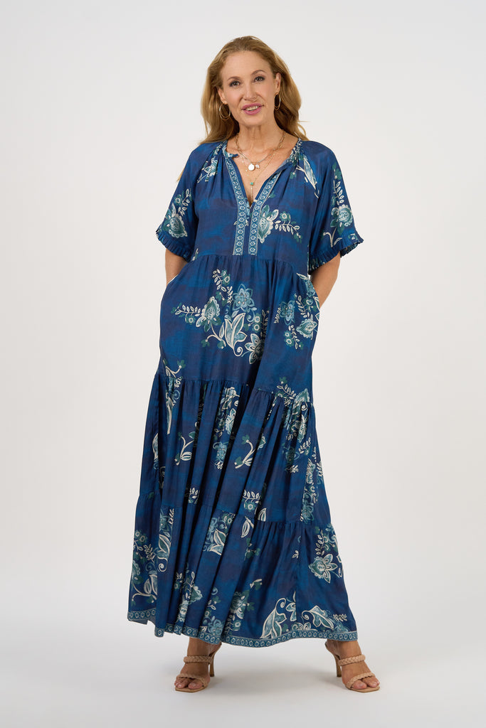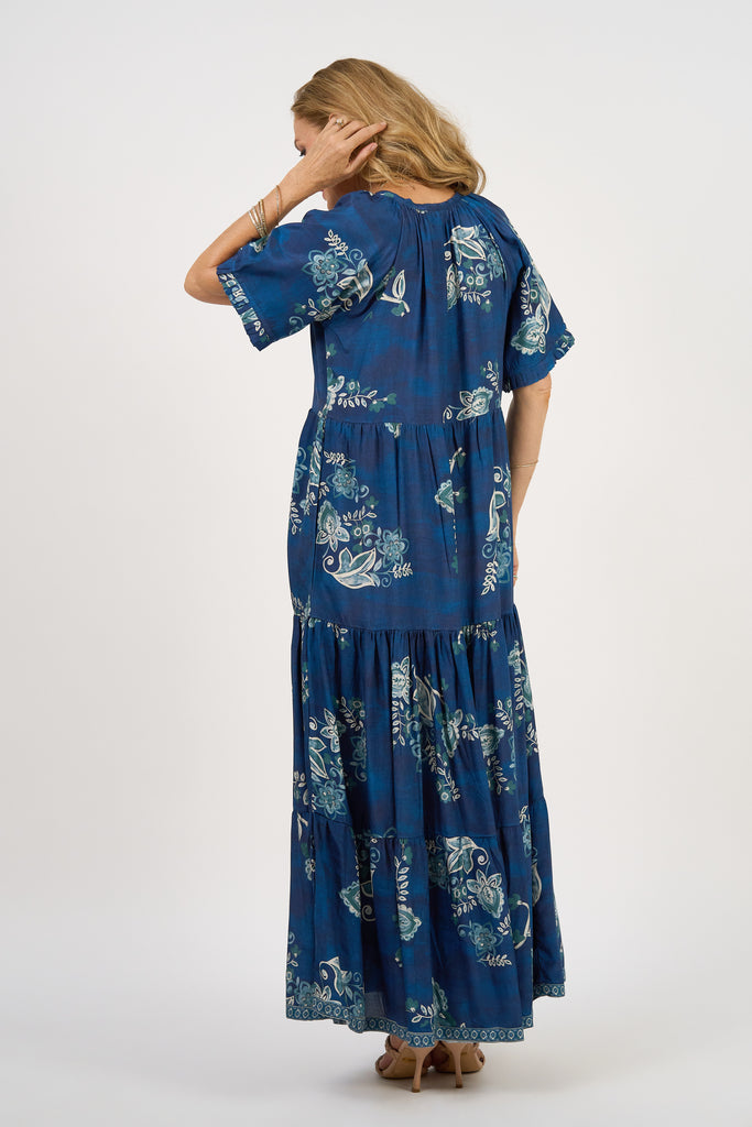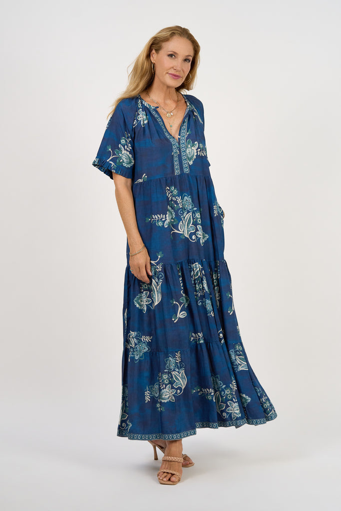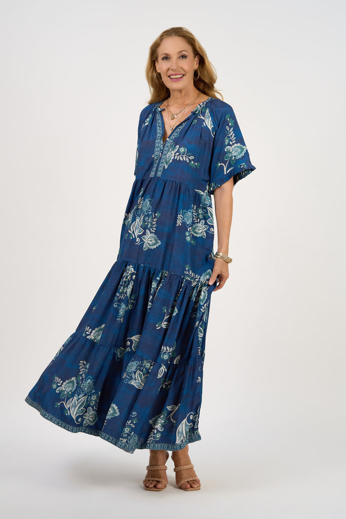 Step into timeless elegance with the Amisha Short Sleeve Maxi Selene, featuring a rich blue hue adorned with delicate floral accents. This airy, tiered silhouette is crafted from lightweight fabric for breezy comfort and effortlessly chic movement. Its relaxed short sleeves and subtly embroidered neckline offer everyday sophistication with bohemian charm. Perfect for day-to-night dressing, the Selene Maxi brings effortless style to any occasion.