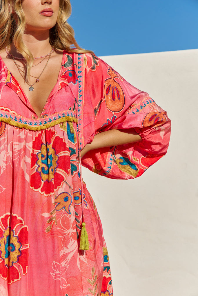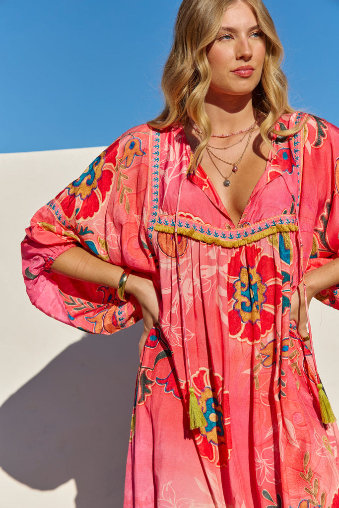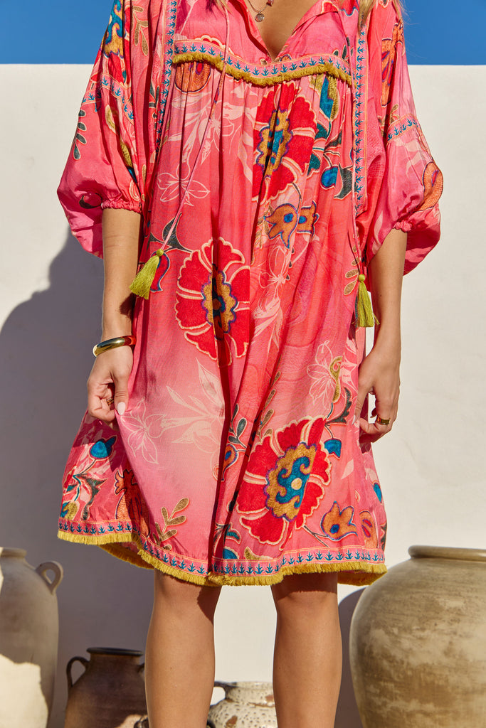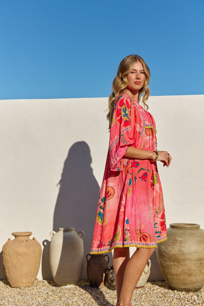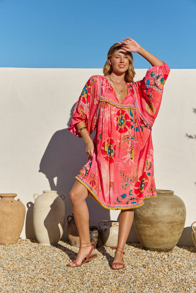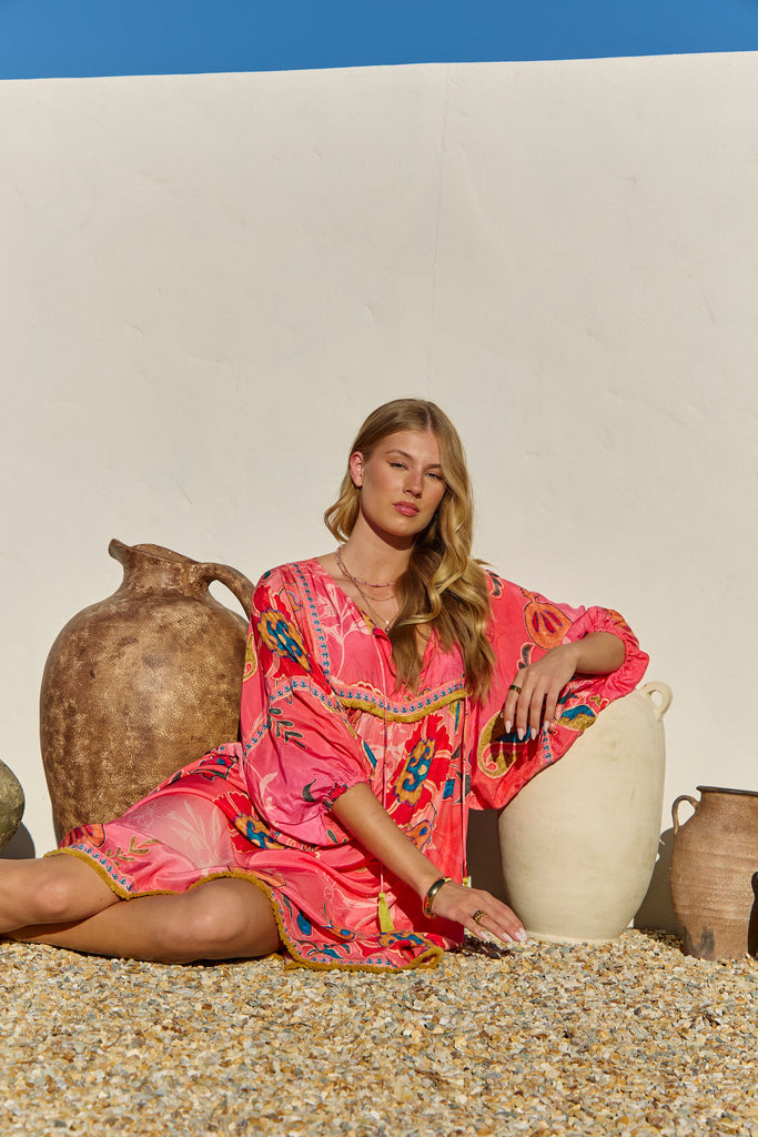 The Bahamas Dress Gloria from the Sundrift collection captures effortless elegance with its soft, flowing silhouette and sun-kissed hues. Light and airy fabric drapes beautifully, making it perfect for warm days and seaside evenings. Its delicate detailing and relaxed fit embody the free-spirited essence of summer wanderlust.