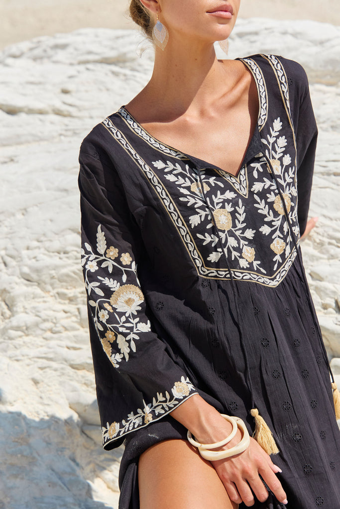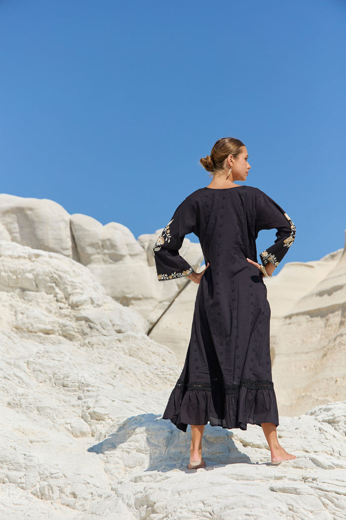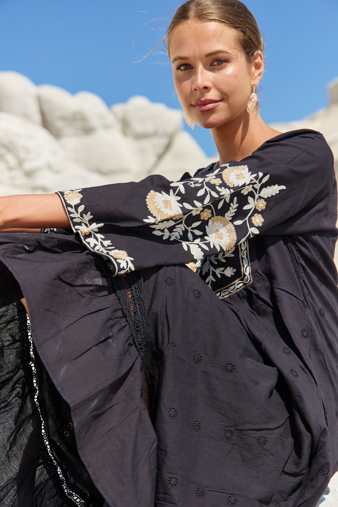 The Daisy Dress Leela Embroidery Black, part of the upcoming Daisy Waves launch, is crafted from 100% cotton, offering both comfort and breathability. Its intricate embroidery gives the timeless black dress a unique and elevated touch, perfect for relaxed days or styled up for evenings. This piece is designed to be an effortless wardrobe staple, fusing quality materials with Daisy's signature playful elegance.