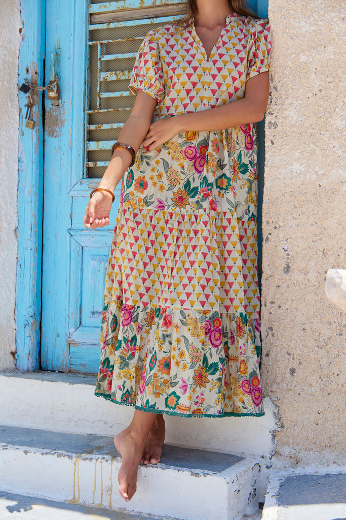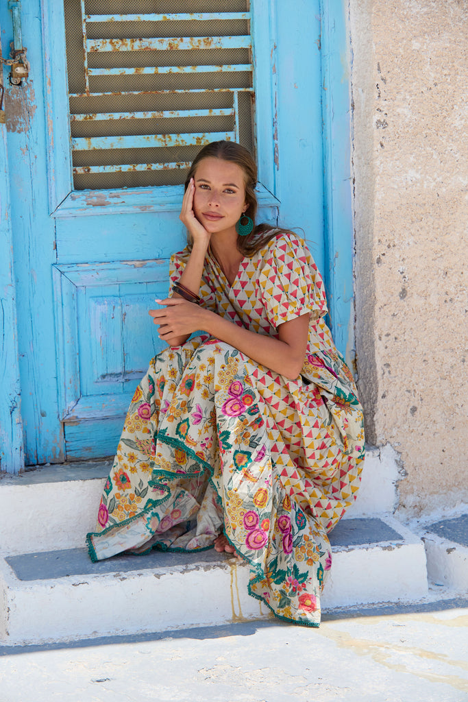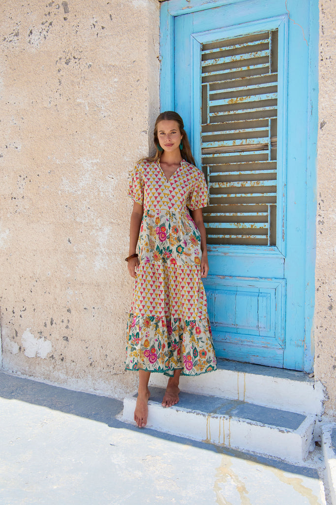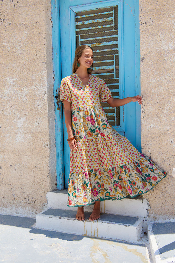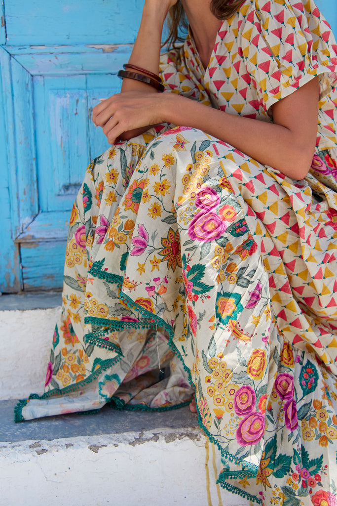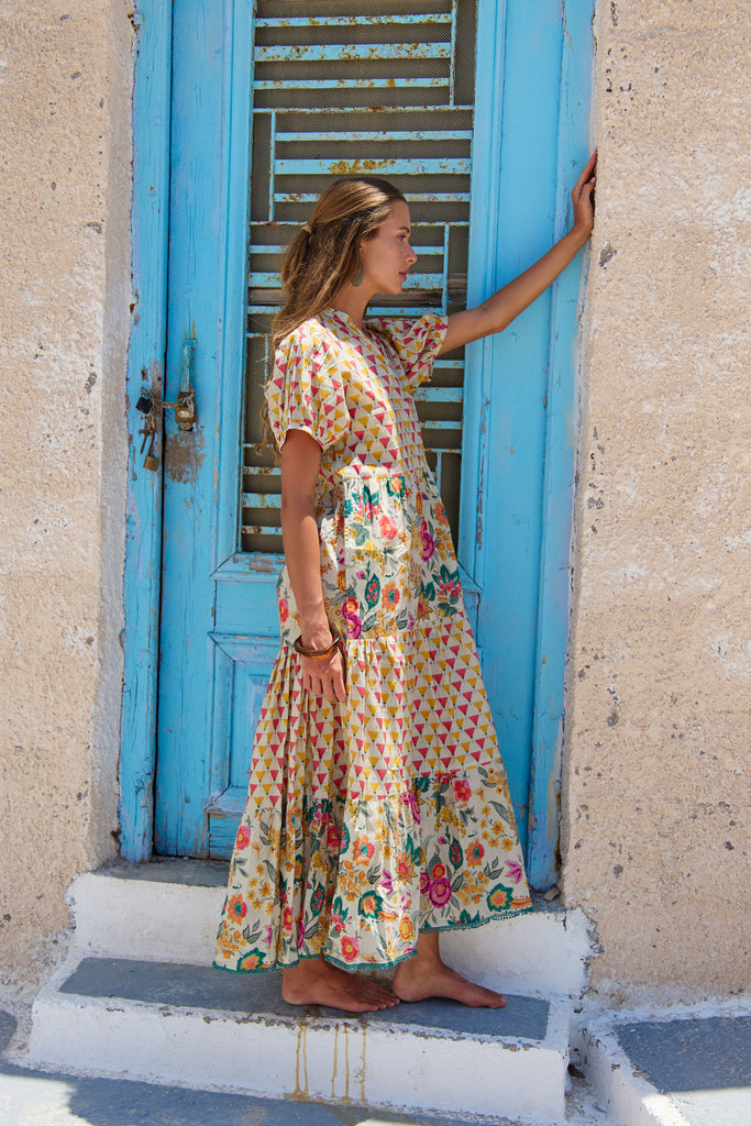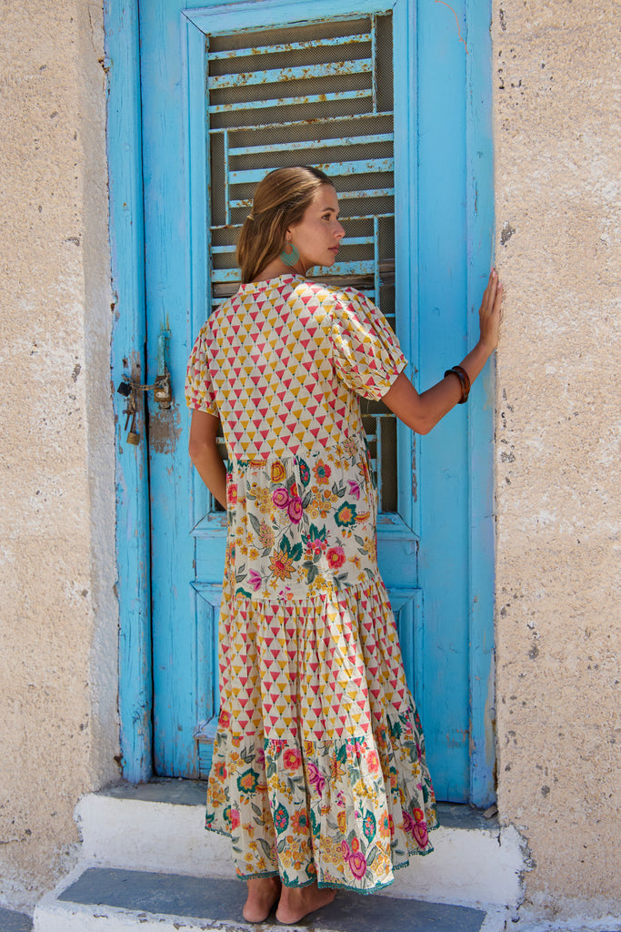 The Frida Maxi Luna Patch from the Daisy Waves Collection Part 2 features a vibrant patchwork design that celebrates bohemian style. Crafted from 100% cotton, this dress ensures maximum comfort and breathability for all-day wear. Its unique artistic details make it a standout piece in the Daisy Waves series, perfect for those who appreciate both fashion and natural fabrics.