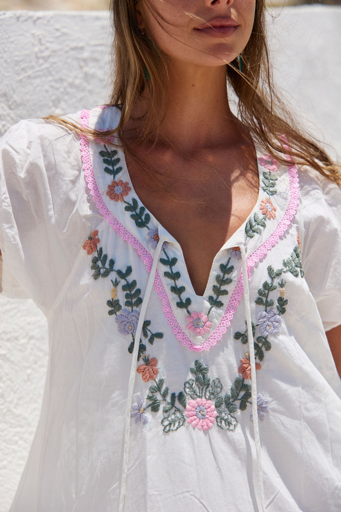 The Sao Paulo Dress from the Naudic Daisy Waves collection features beautiful Jewel Aari embroidery and is made from 100% cotton, making it soft, breathable, and perfect for comfortable wear. This collection is designed in Australia and crafted in India, blending vibrant style with artisan detailing. The dress provides a flattering fit and showcases signature embroidery that makes each piece unique