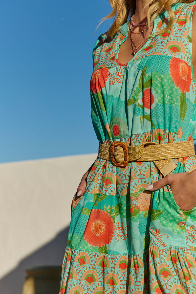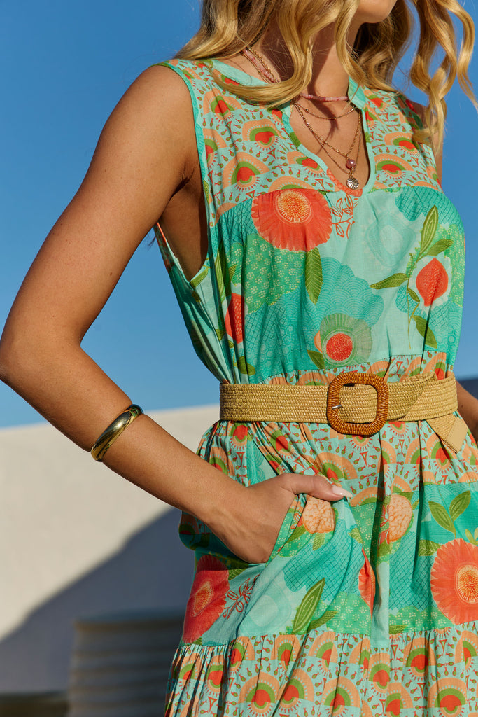 The Lulu Maxi Sunny Patch is a breezy statement piece from the Sundrift collection, designed in a mix of vibrant patchwork prints that radiate warmth and free-spirited charm. Its flowing silhouette and soft cotton fabric make it perfect for sun-soaked days or seaside escapes. Pair it with sandals and layered jewelry for an effortless, bohemian look that captures the essence of summer wanderlust.