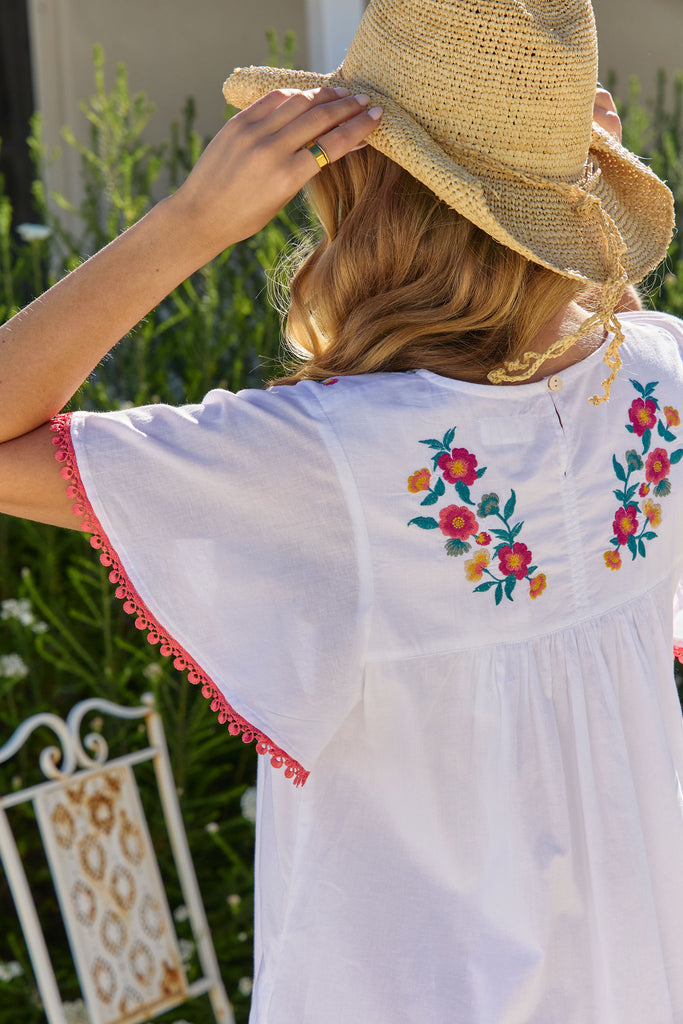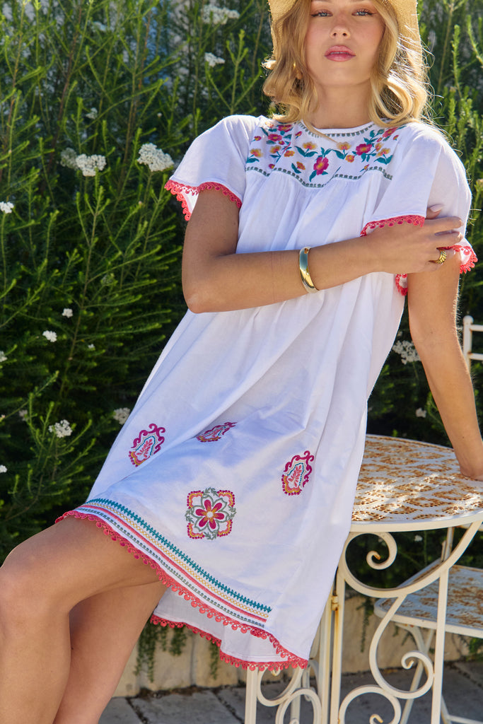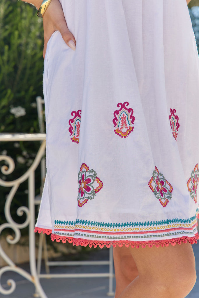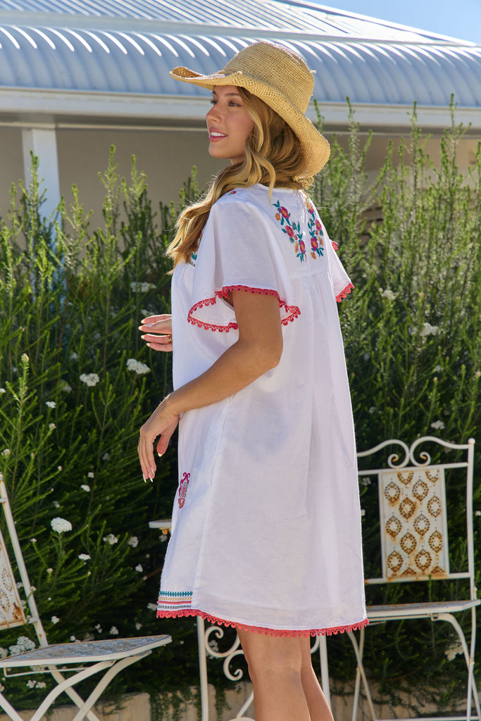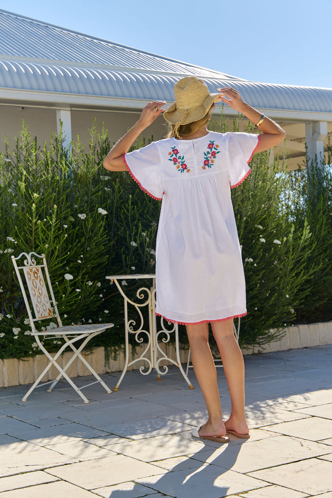 The Emma Dress in Ruby Embroidery white from Naudic's Sun Weaver spring collection features intricate floral embroidery in vibrant ruby tones against a crisp white cotton base, evoking the sunlit shores of Stradbroke Island. Its flowing midi silhouette and lightweight fabric make it ideal for breezy coastal days, blending bohemian elegance with effortless wearability inspired by Australian natural light and weaving motifs. Delicate aari embroidery details add a touch of artisanal craftsmanship, perfect for layering with accessories from the same collection for a complete sun-drenched look. This piece captures the essence of renewal and joy, with its breathable design ensuring comfort during spring adventures or casual outings