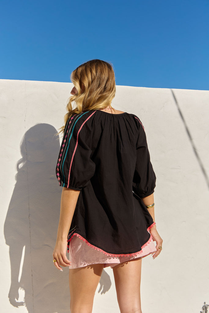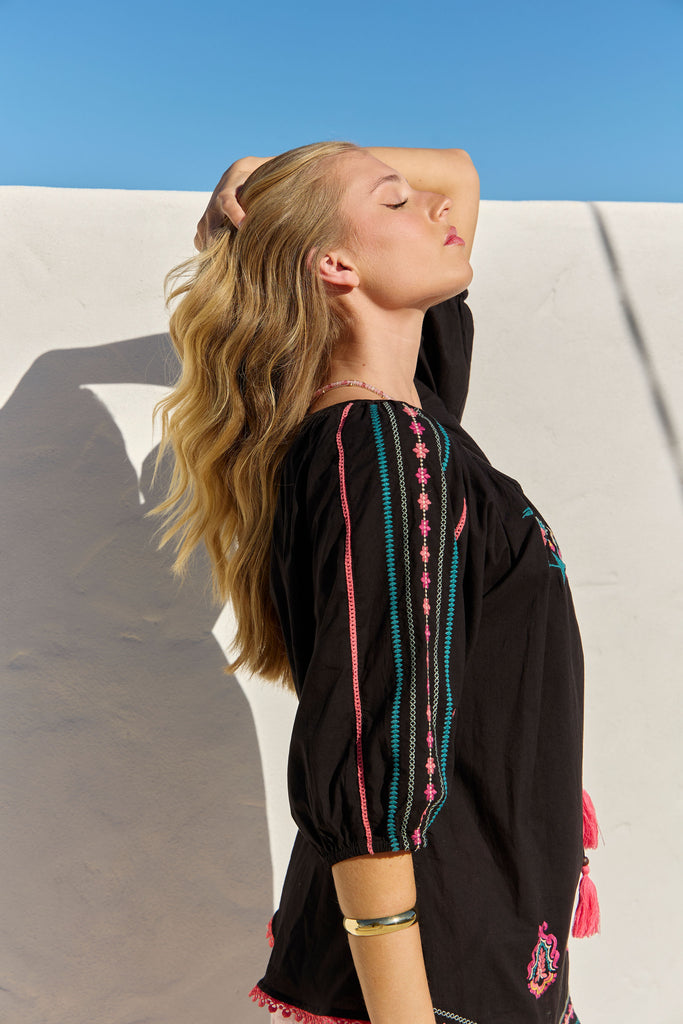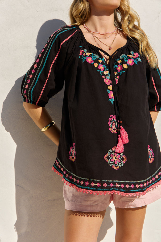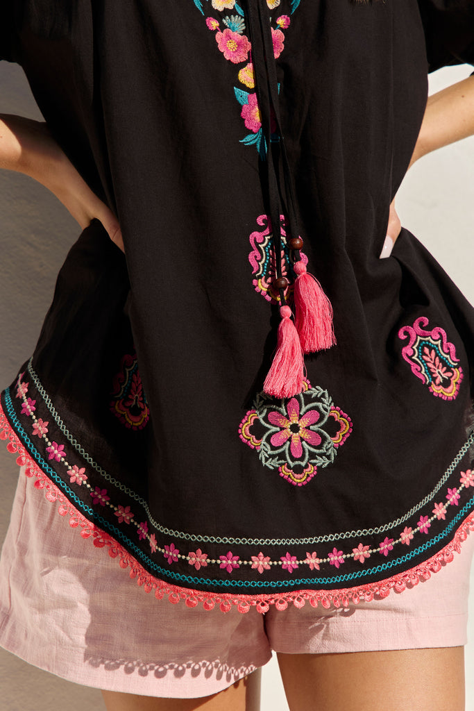 The Oregon Top Ruby Embroidery brings boho-chic flair to any outfit with its striking floral embroidery and vibrant stitched detailing. Crafted from breezy black fabric, this relaxed silhouette features wide sleeves and a playful tie-front neckline for effortless comfort. Embellished with bright accents and intricate designs, it pairs perfectly with shorts, jeans, or skirts for versatile summer styling. Add the Oregon Top to your wardrobe for a statement piece that’s both easy-going and full of character.