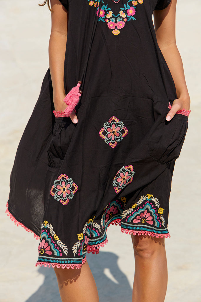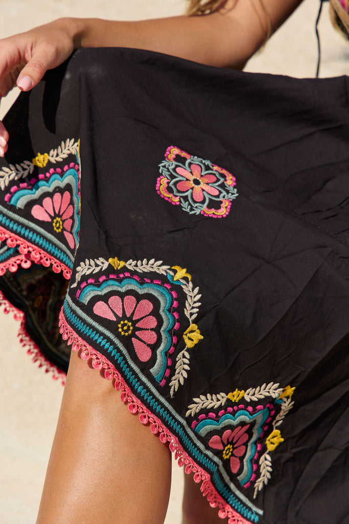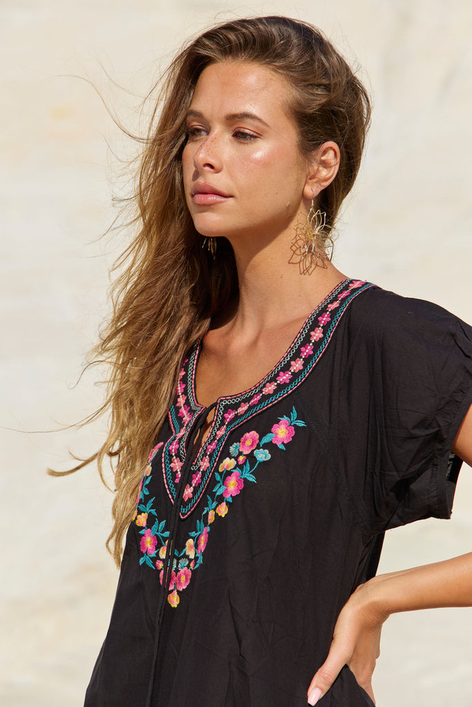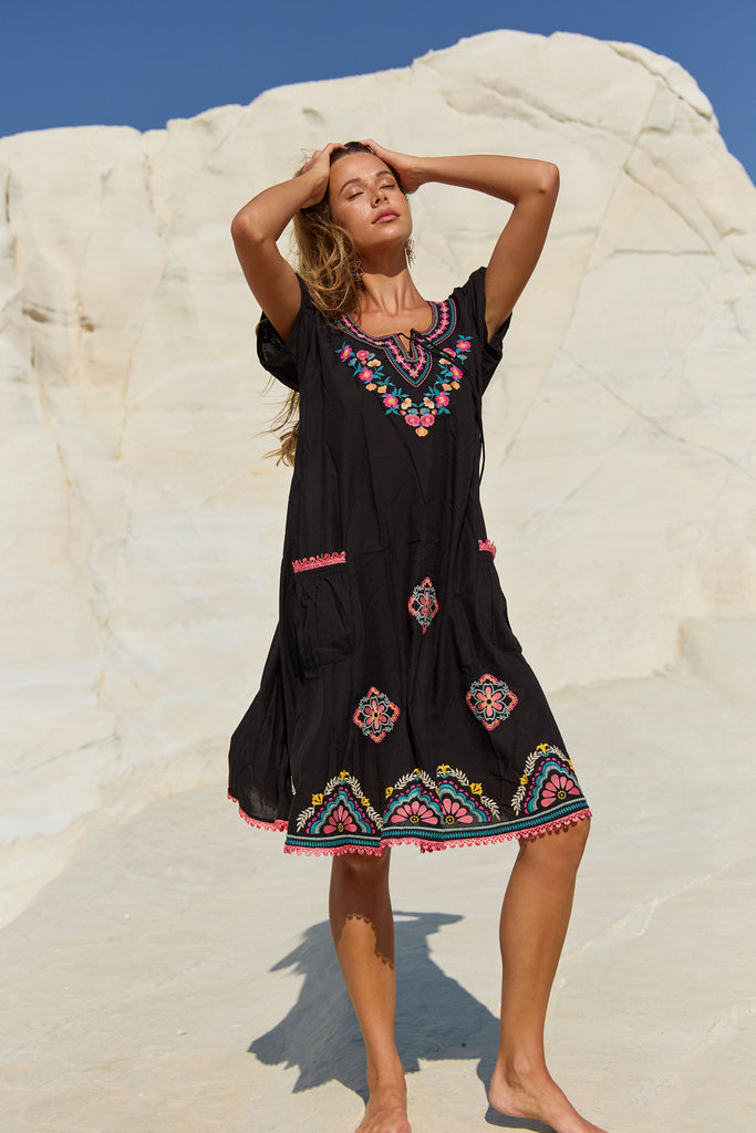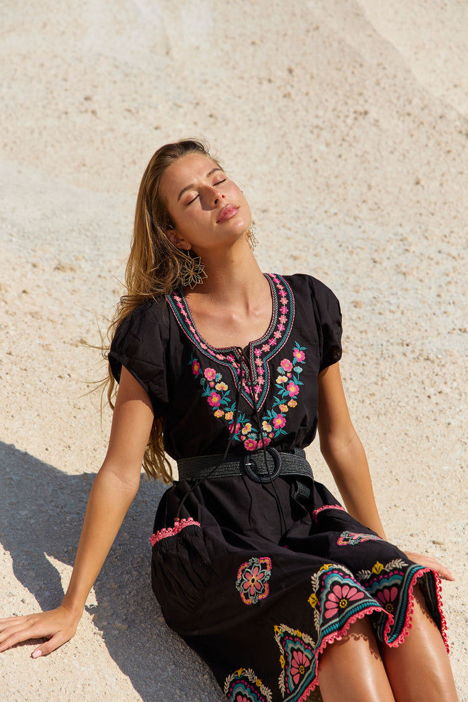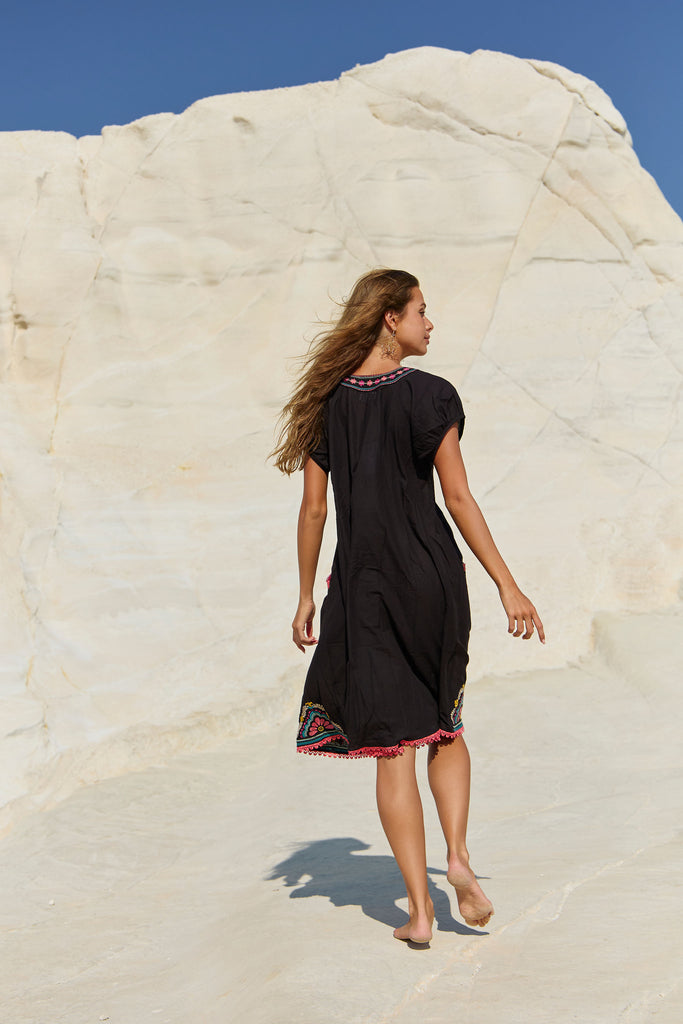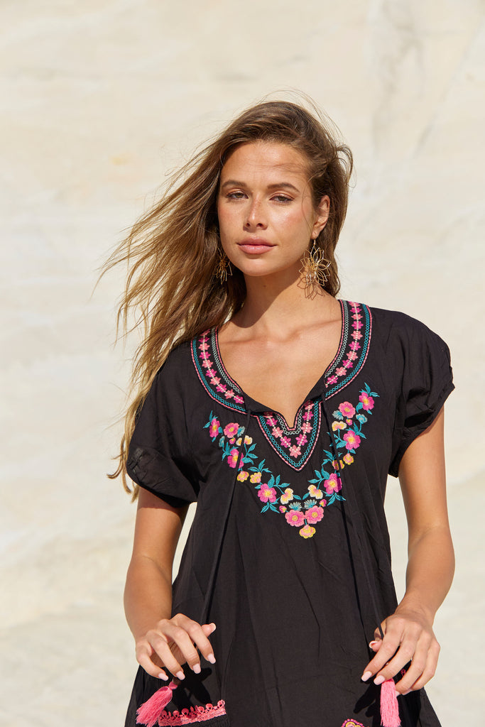Experience vibrant bohemian style with the Sao Paulo Dress Ruby Embroidery, featuring intricate, colourful floral embroidery on a breezy black base. This relaxed silhouette offers easy movement and comfort, with playful tassel accents and striking hem details for added flair. The lightweight fabric and short sleeves make it perfect for summer escapes and sunny adventures. Elevate your everyday look or beach wardrobe with this effortless and eye-catching piece.