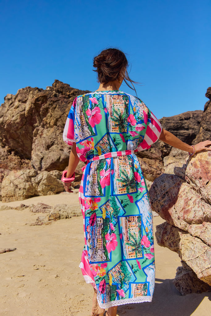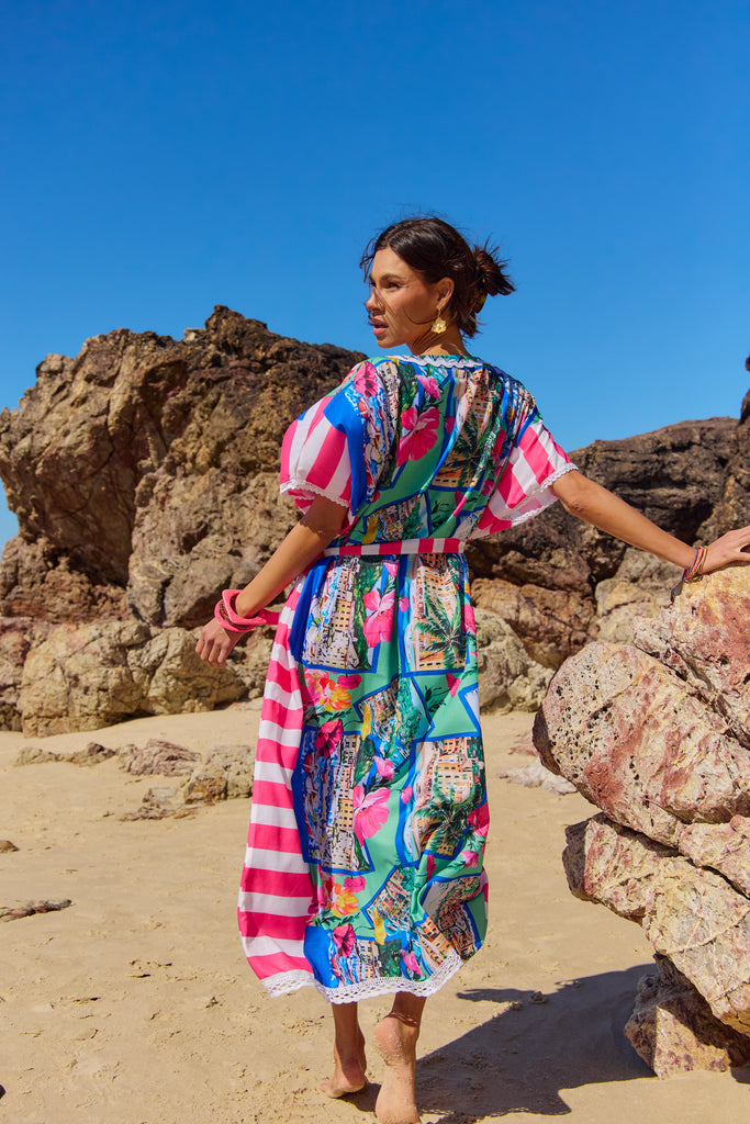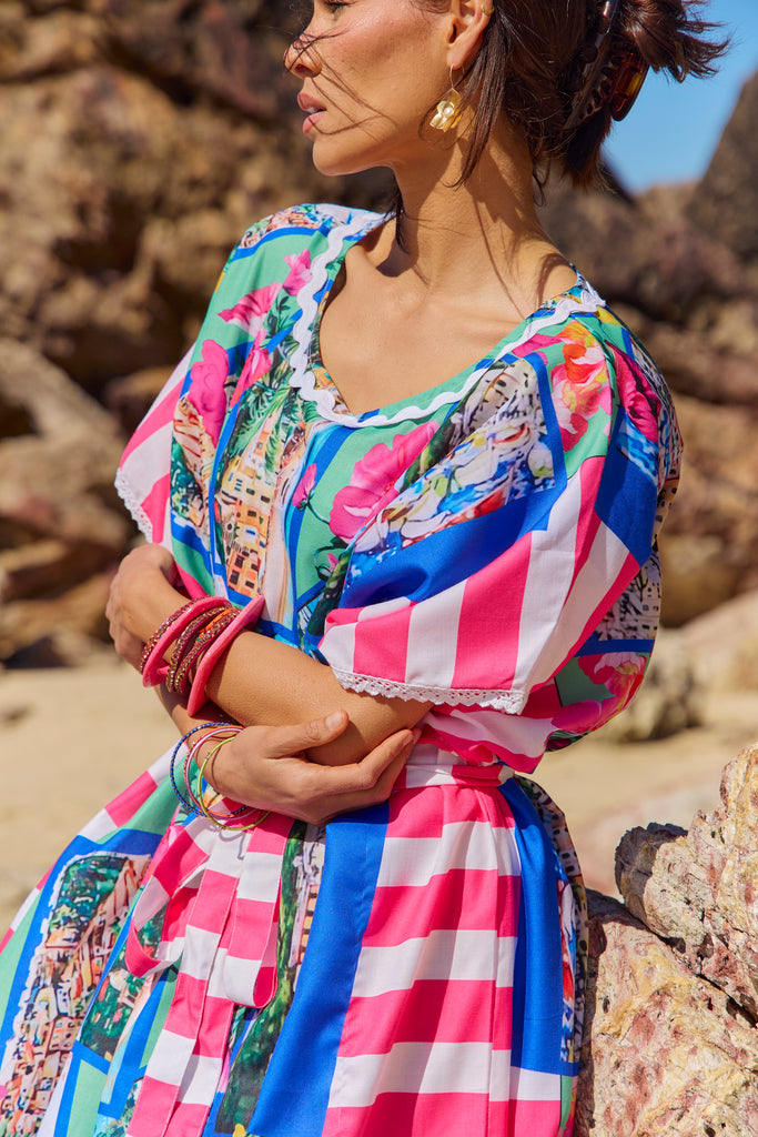 The Naudic Hamption Kaftan in the Riviera print is a breezy, crafted from lightweight,cotton voile that drapes beautifully over swimwear or slips. Its vibrant Riviera print channels the sun-drenched colors of the French coast with bold stripes of cobalt, coral, and lemon against a crisp white base. Finished with subtle crochet trim along the V-neckline and wide kimono sleeves, it brings effortless bohemian elegance to beach days or resort evenings. Easy to pack, quick to throw on, and instantly chic, the Hamption Kaftan has become a signature Naudic piece for warm-weather wardrobes. 100% Viscose