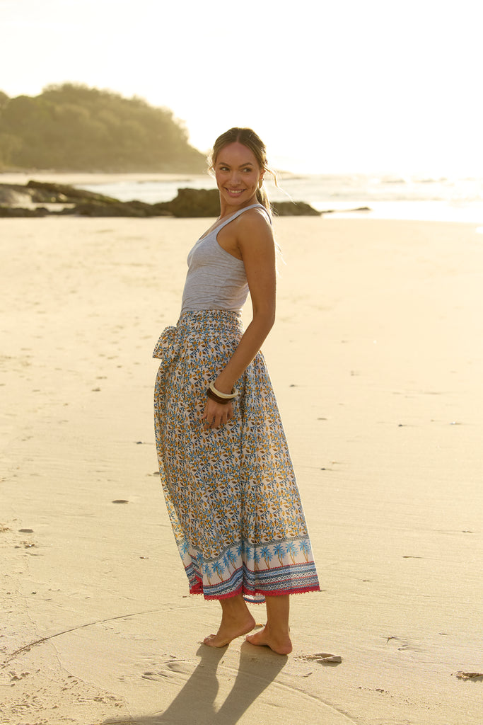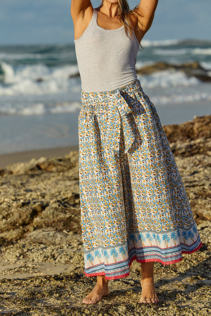 A wide smocked waistband provides an easy, flexible fit, while the self-tie belt adds shape and a touch of relaxed styling. The flowing silhouette and beautifully detailed border hem give the Hendrix Pant a carefree, resort-inspired look—perfect for beach walks, market mornings, or effortless summer outfitting.