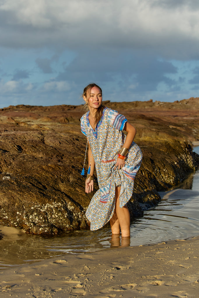The Sao Paulo Maxi Dress returns in Naudic’s luminous Sahara print, a sun-drenched blend of soft botanicals, sky-blue accents, and vibrant border detailing. Made from 100% lightweight cotton, this maxi drapes effortlessly with a floaty, free-spirited silhouette that moves beautifully with every step.