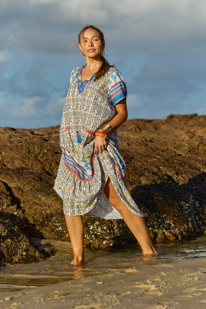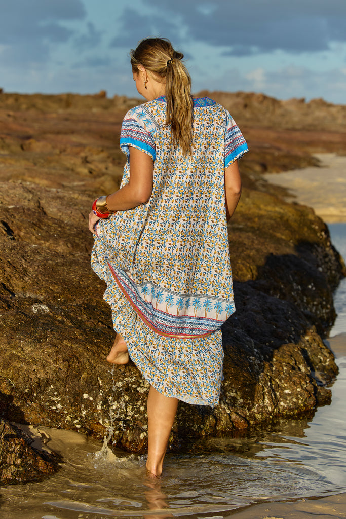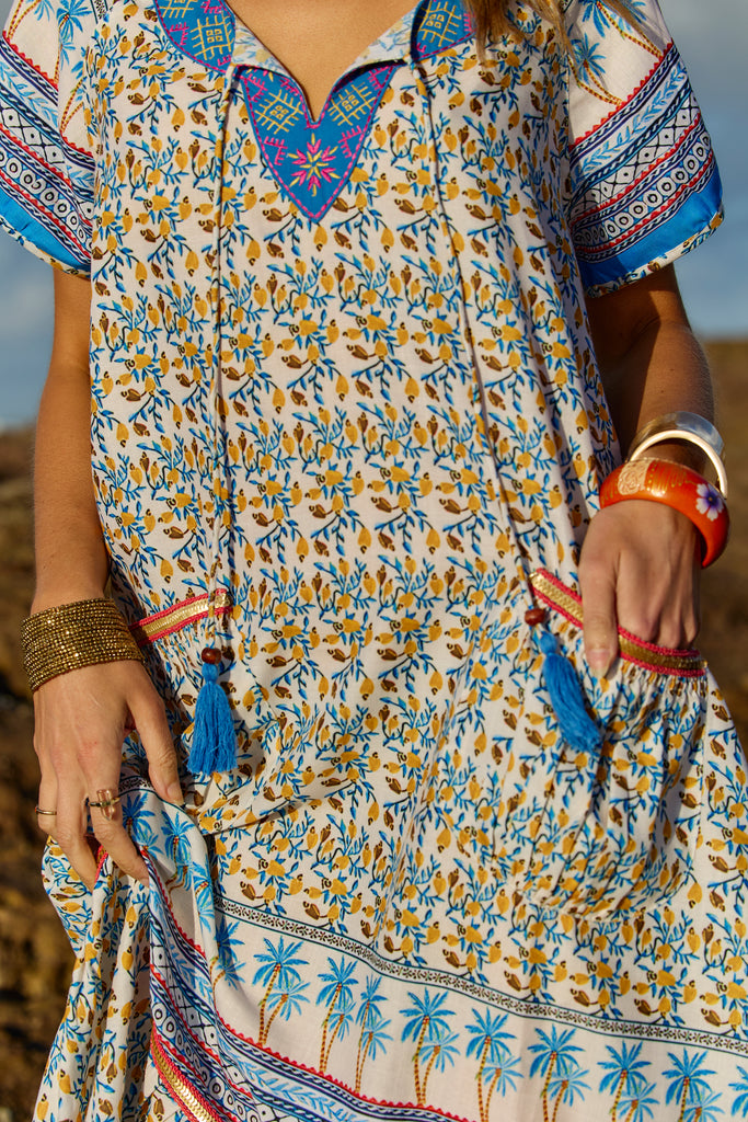 The signature embroidered neckline adds a pop of colour, complete with tassel ties for a playful finish. Gentle cap sleeves, an easy relaxed fit, and the striking palm-border hem make this an ideal throw-on style for warm days—perfect for beach escapes, resort lounging, or everyday summer ease.