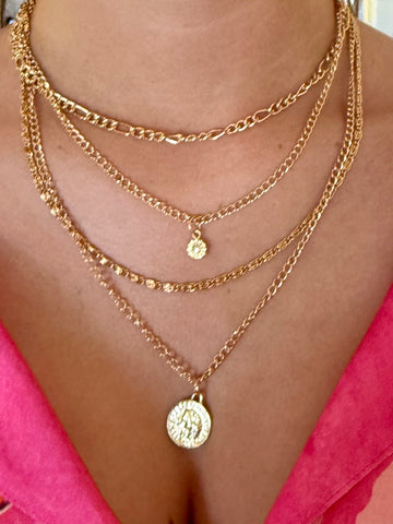Instantly create a dramatic layered look with our Prospect Layered Necklace. A statement piece featuring golden chains and two stylish charms. Feel chic in this 4-in-1 statement piece. Add impact with just one accessory.