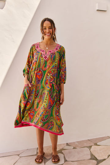 The Sao Paulo Dress in 3/4 sleeve Peppi print captures the effortless vibrancy of Naudic's Resort collection, blending tropical allure with everyday elegance. Crafted from 100% viscose for a soft, breathable feel that drapes beautifully against the skin, this midi-length dress features a relaxed A-line silhouette with subtle gathering at the waist for flattering movement. The 3/4 sleeves add a touch of sophistication, while the bold Peppi print—evoking sun-drenched Brazilian streets—infuses every wear with playful energy. Perfect for beachside strolls or casual city outings, it pairs seamlessly with sandals or espadrilles.