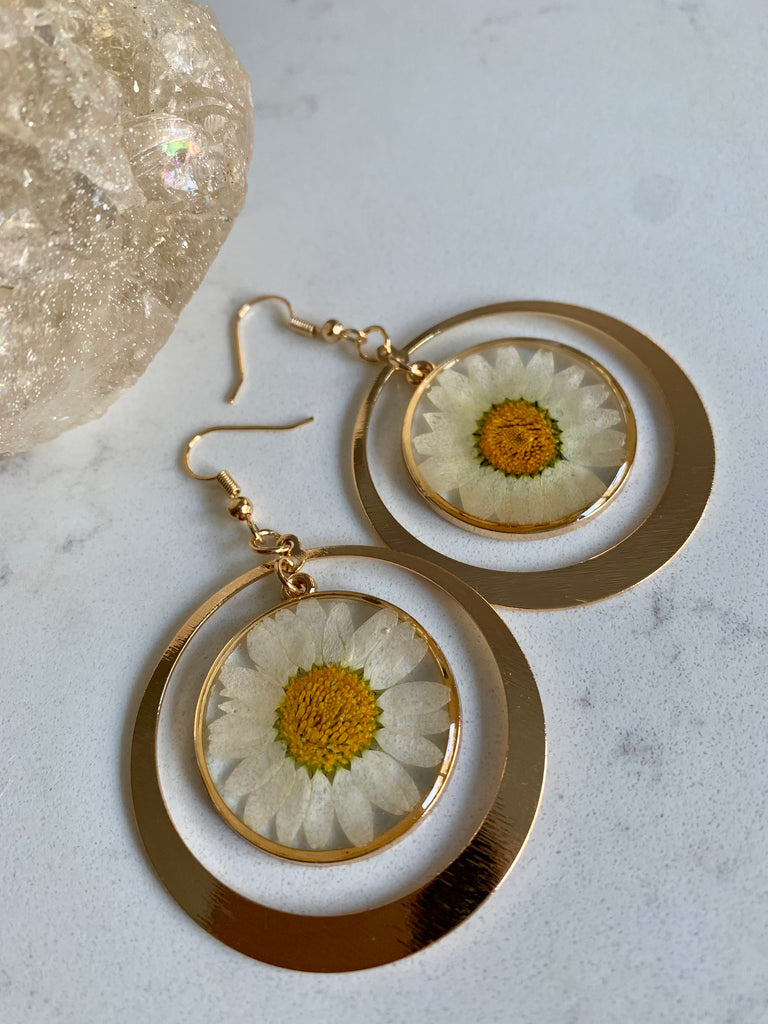 Celebrate nature in bloom with these playful earrings, featuring real pressed daisy flowers delicately encased in crystal-clear resin. Suspended within a matte gold frame, the daisies bring a touch of wildflower magic to the design.