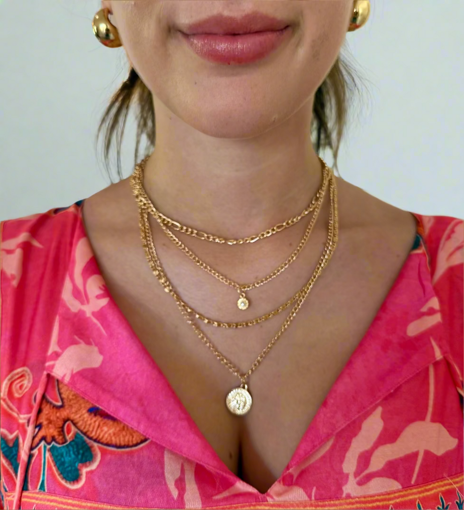 Instantly create a dramatic layered look with our Prospect Layered Necklace. A statement piece featuring golden chains and two stylish charms. Feel chic in this 4-in-1 statement piece. Add impact with just one accessory.