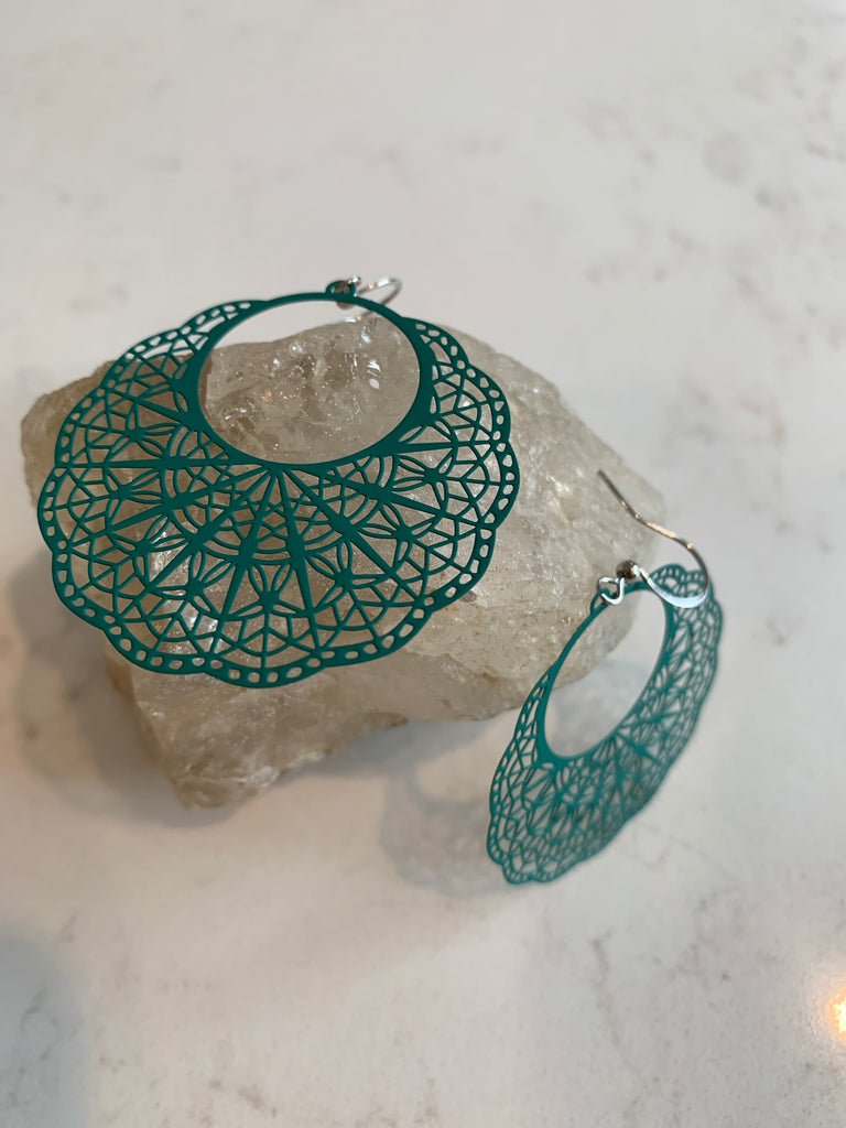 Add a pop of color and effortless style to your look with these teal lacy earrings.