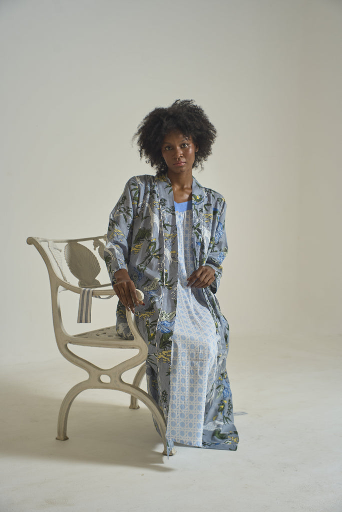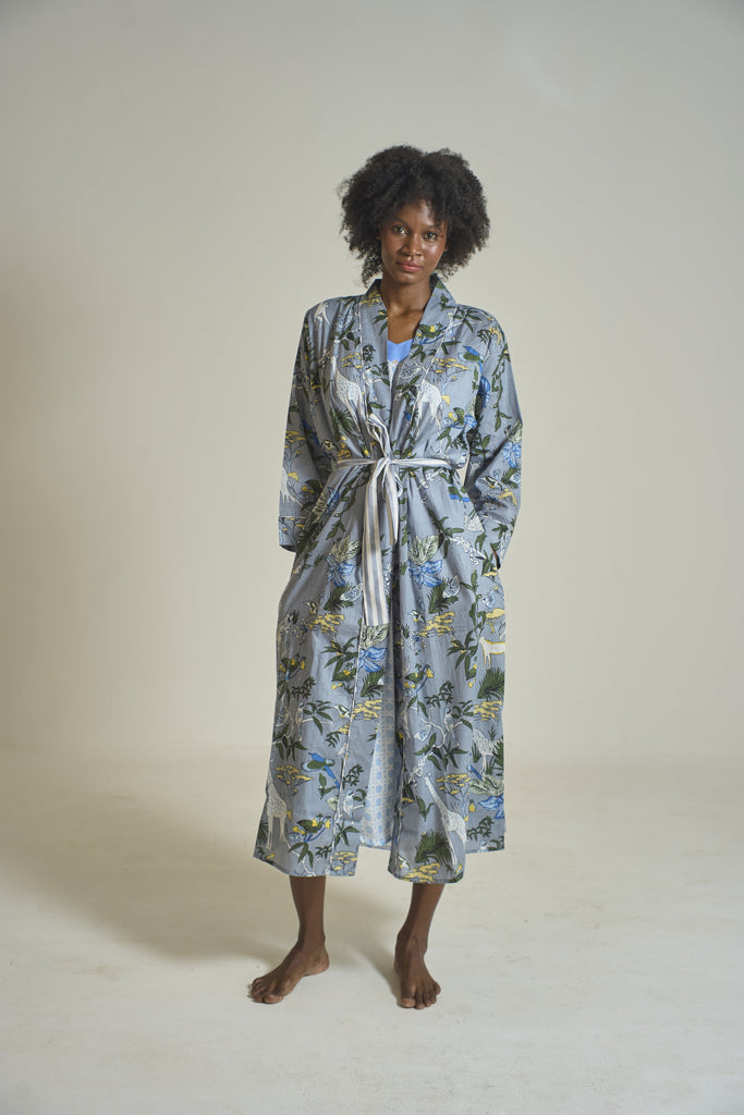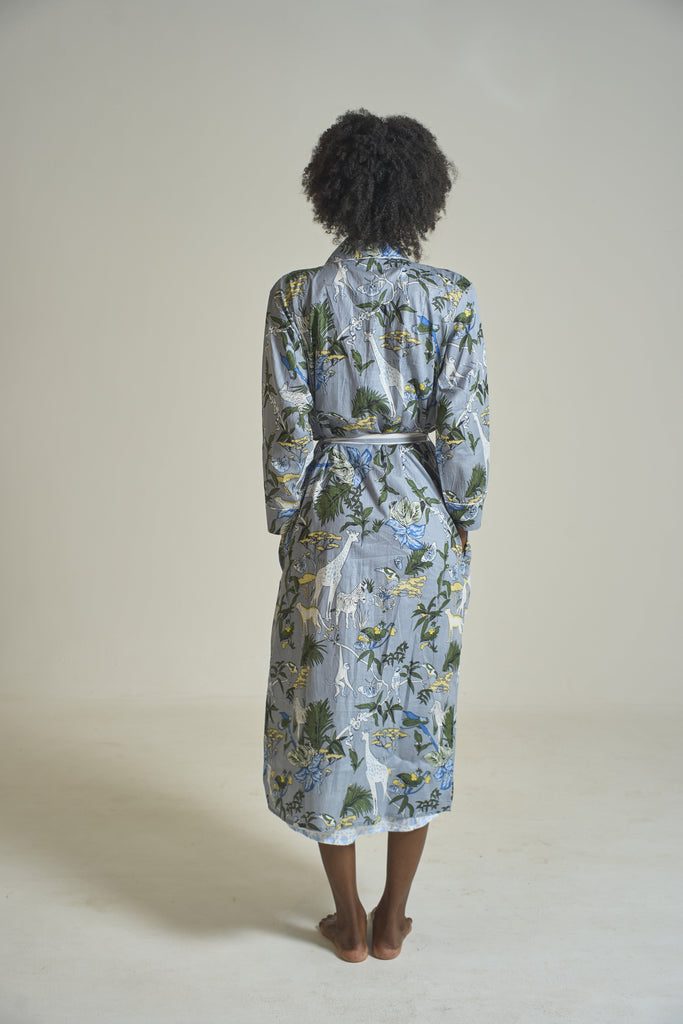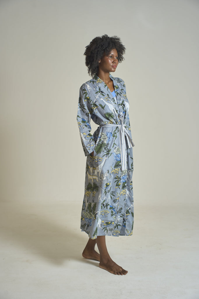 Vintage by Naudic is venturing into the realm of nighttime comfort with a special soft, breathable cotton sleepwear collection that promises to infuse bedtime with the brand's stunning signature style. Indulge in a little luxury wearing this divine Robe in Baka Stripe Print featuring exotic wildlife and botanical beauty set on an elegant grey backdrop. Featuring a matching tie and exquisite piping details, this robe ensures ultimate comfort making bedtime a truly serene experience. Complete your look by pairing with our Kina Pop Cotton Nightie as pictured for a relaxing night at home.