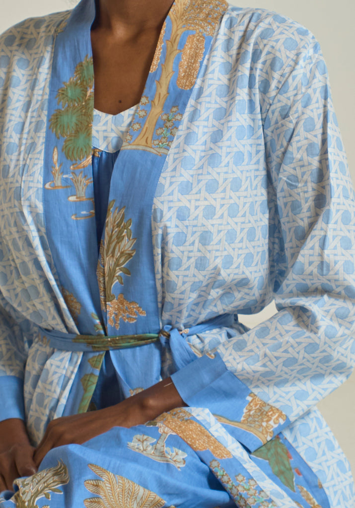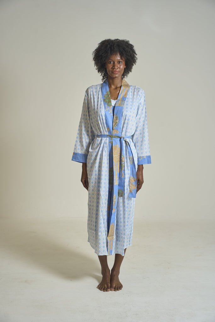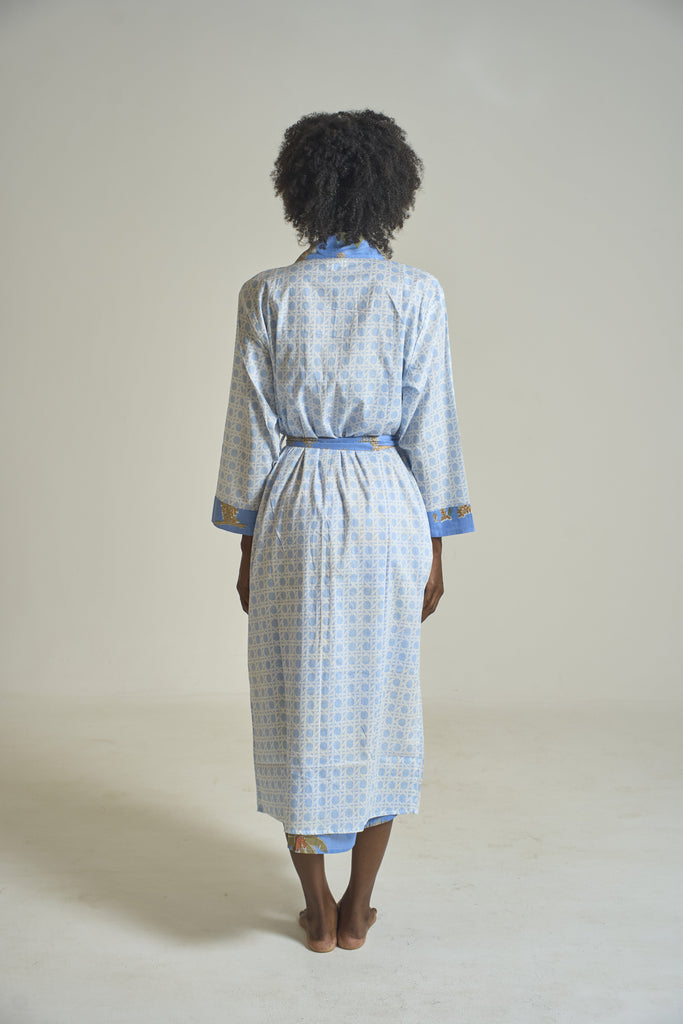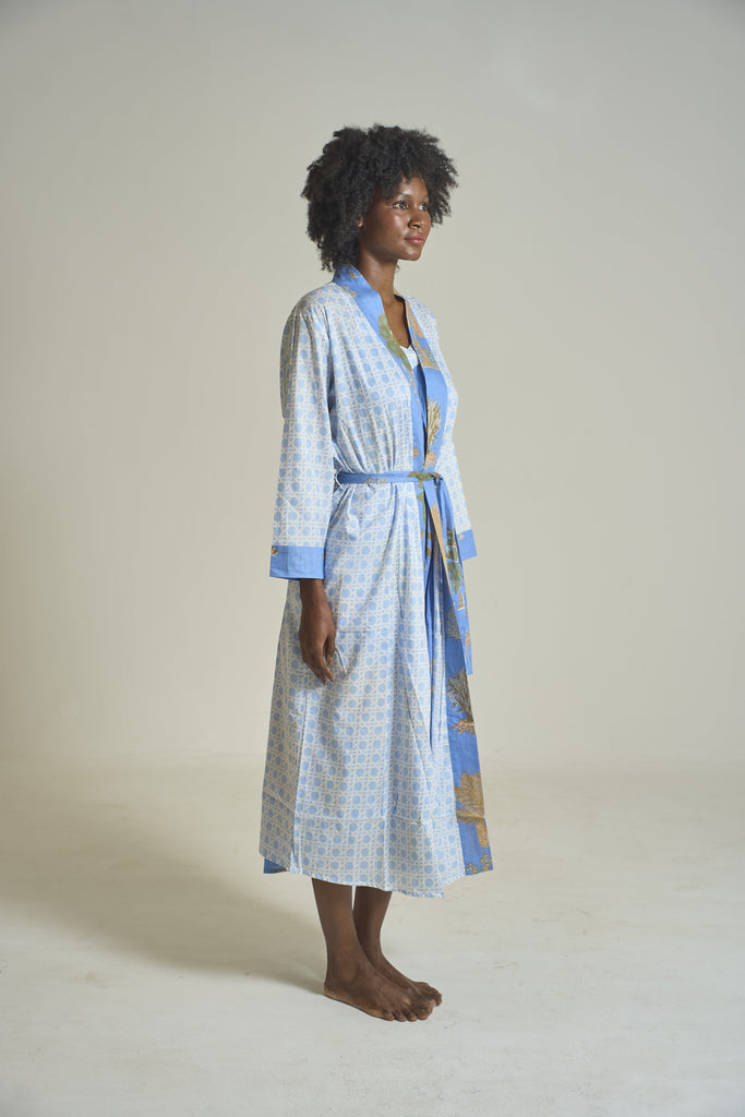 Vintage by Naudic is venturing into the realm of nighttime comfort with a special soft, breathable cotton sleepwear collection that promises to infuse bedtime with the brand's stunning signature style. Pamper yourself wearing this divine Robe in Kina Pop Print featuring playful geometric patterns in serene blue and white with gorgeous contrasting collar and cuffs. Featuring a matching tie, this robe ensures ultimate comfort making bedtime a truly serene experience. Complete your look by pairing with our Kina or Kina Pop Cotton Nightie for a relaxing night at home.