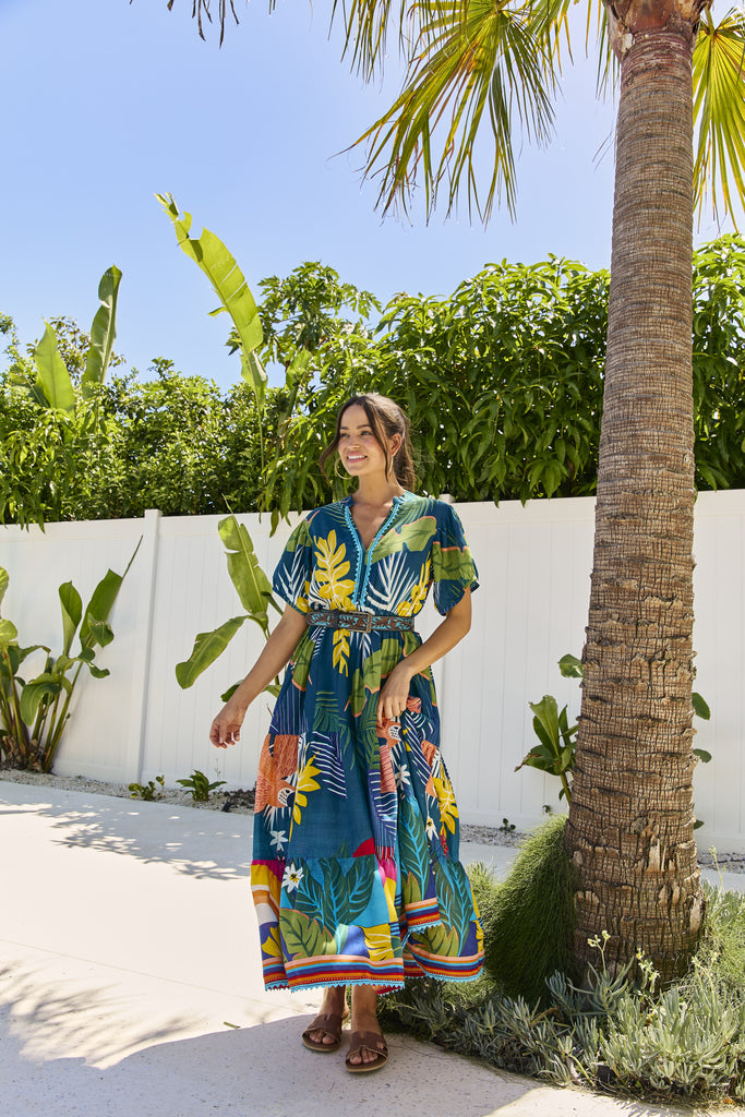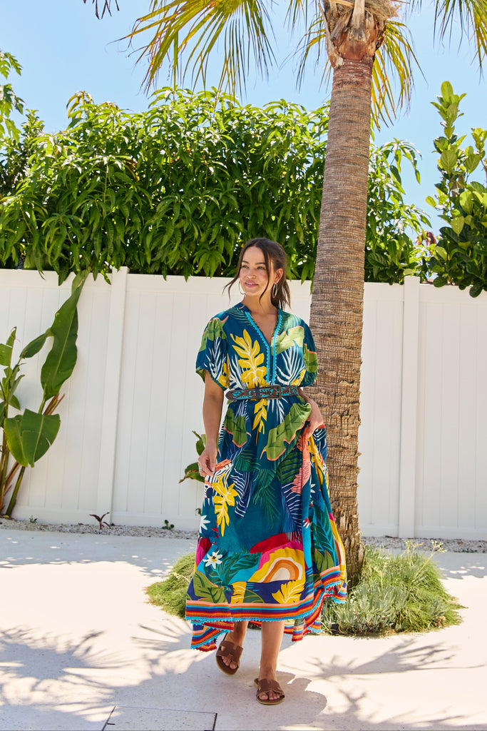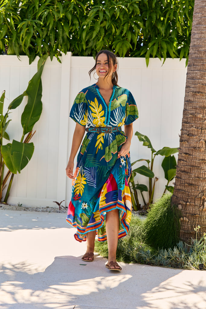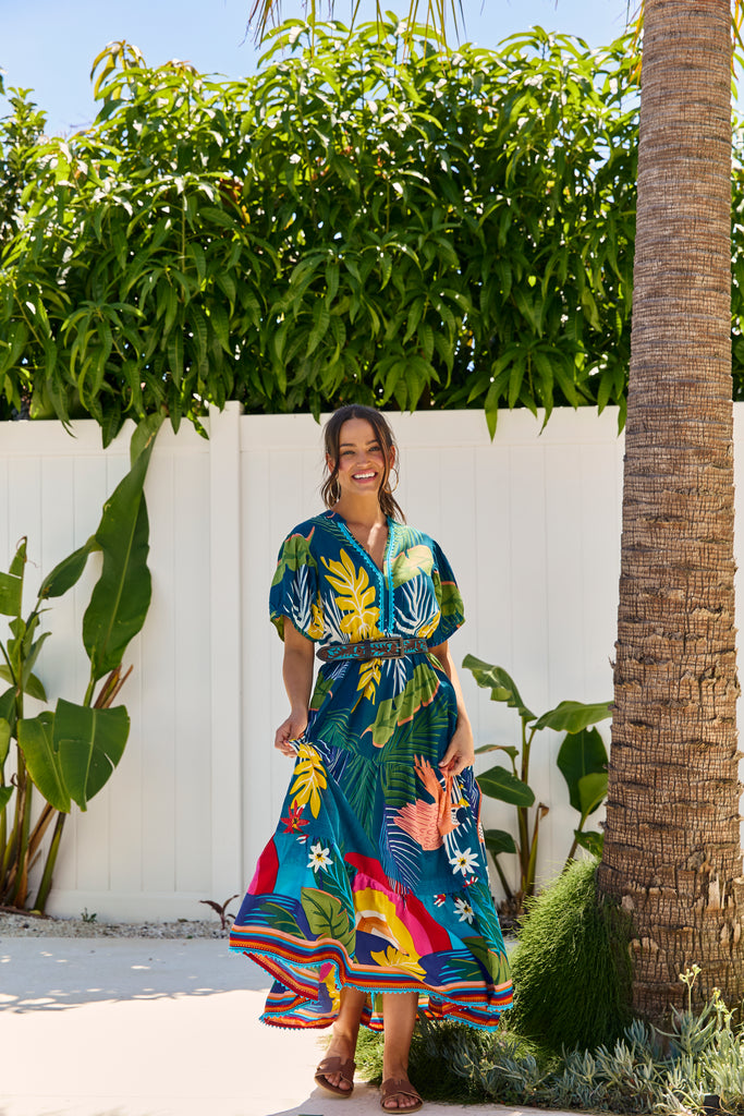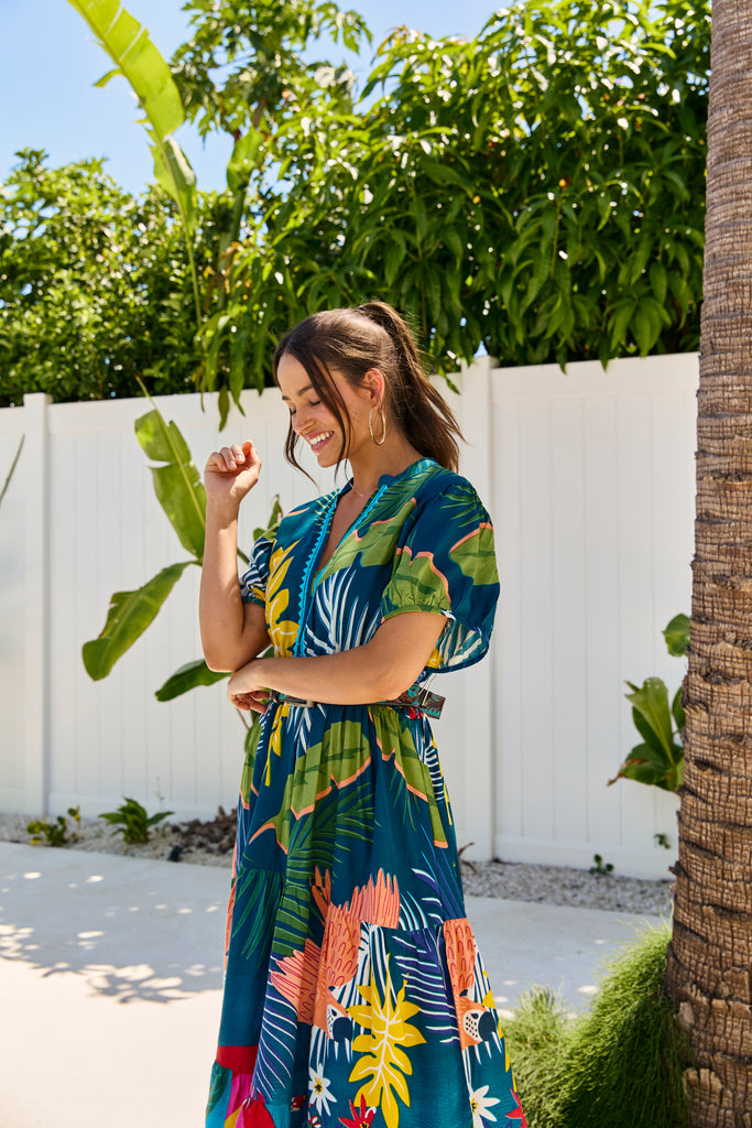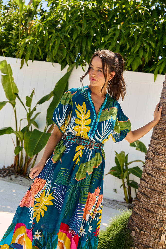 Step into a world of vibrant colour and tropical bliss in our stunning Frida Maxi in Boojee Print. Crafted from a luxurious viscose, this dress drapes the body beautifully creating a flattering silhouette for all. The structured bodice is elevated with delicate aqua lace trimmings and the gently gathered, capped sleeves, elasticised waist and feminine, tiered skirt ensure a flattering fit for all. This breathtaking Frida Maxi is the perfect frock for your next special occasion.