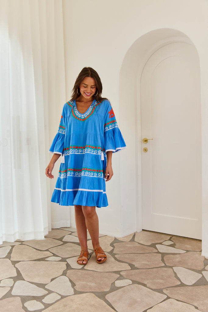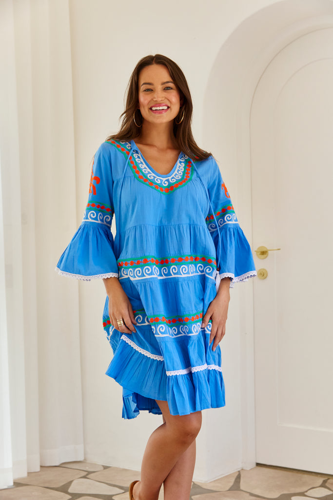 Envelop yourself in the symphony of vibrant embroidery that is our Lulu Dress in Aari Embroidery. The soft, breathable cotton fabric drapes the body beautifully ensuring a flattering fit for all. This beloved style features our unique Lulu U shaped neckline and has been enhanced with the addition of longer sleeves with divine frill. Gently gathered tiers cascade beautifully down the body finishing perfectly with striking orange and white details on the flirty, lower frill.