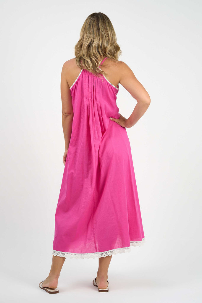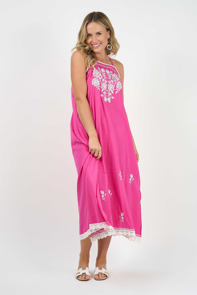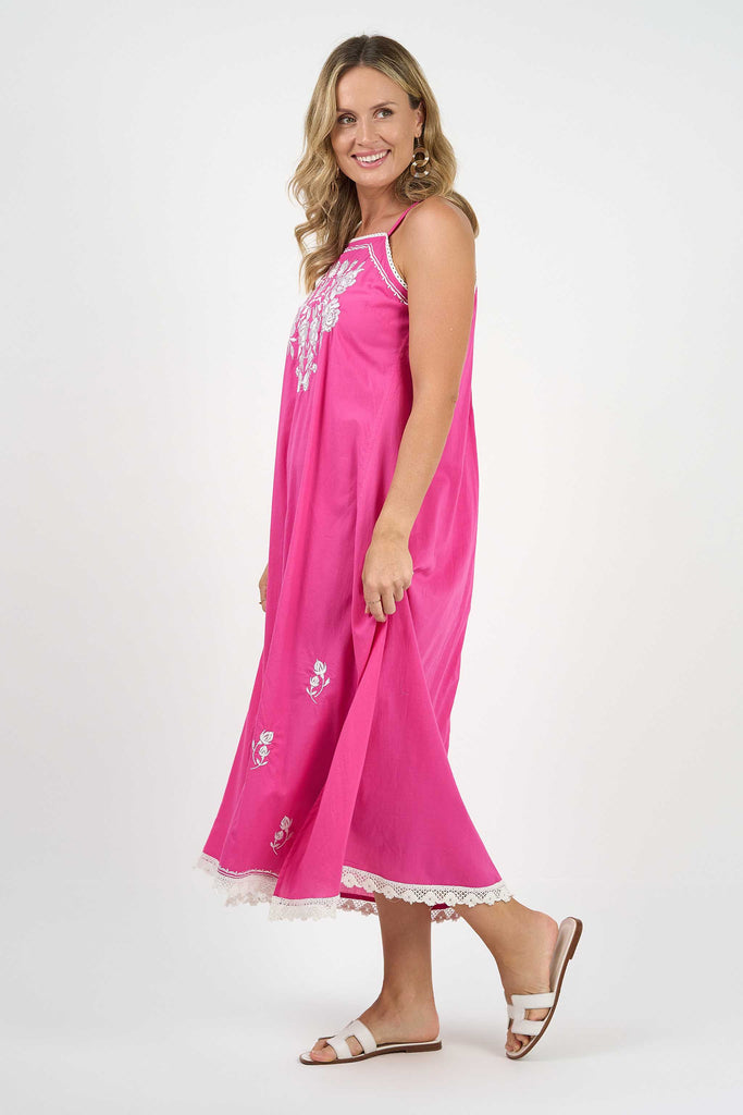 This enchanting Nikki Maxi in Rosaline Embroidery blooms with a timeless grace. The rich, vibrant pink hue serves as a perfect canvas for the intricately embroidered stylised roses, meticulously stitched in a lustrous white thread. This alluring design has delicate, adjustable spaghetti straps, small side splits and beautiful pintucking on the back that create a beautiful, feminine silhouette. Delicate white cotton lace trimmings finish the look perfectly.