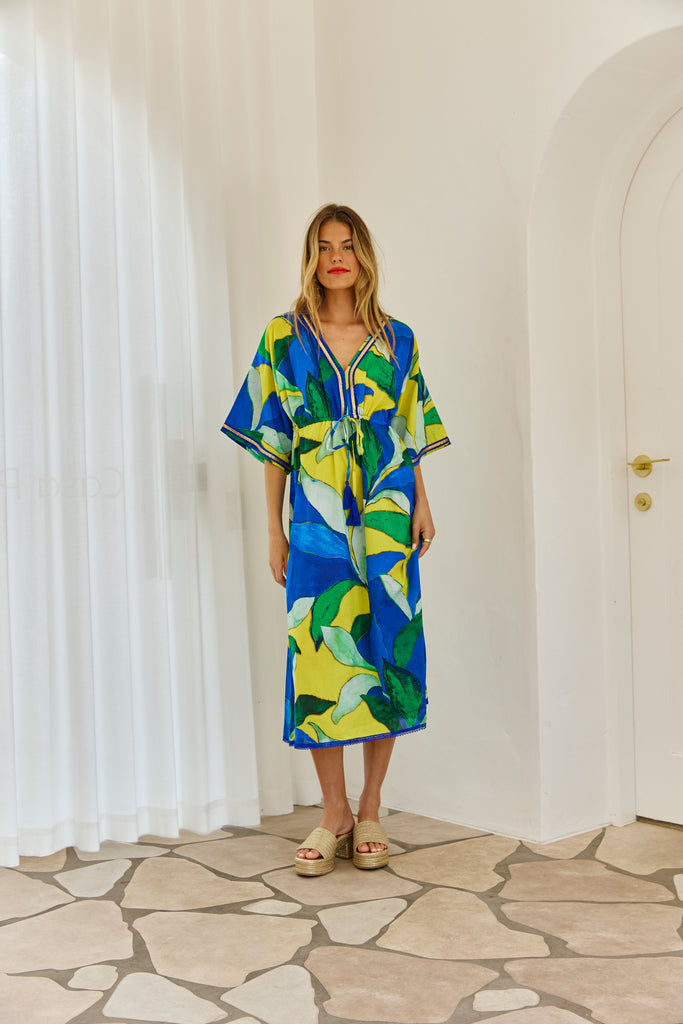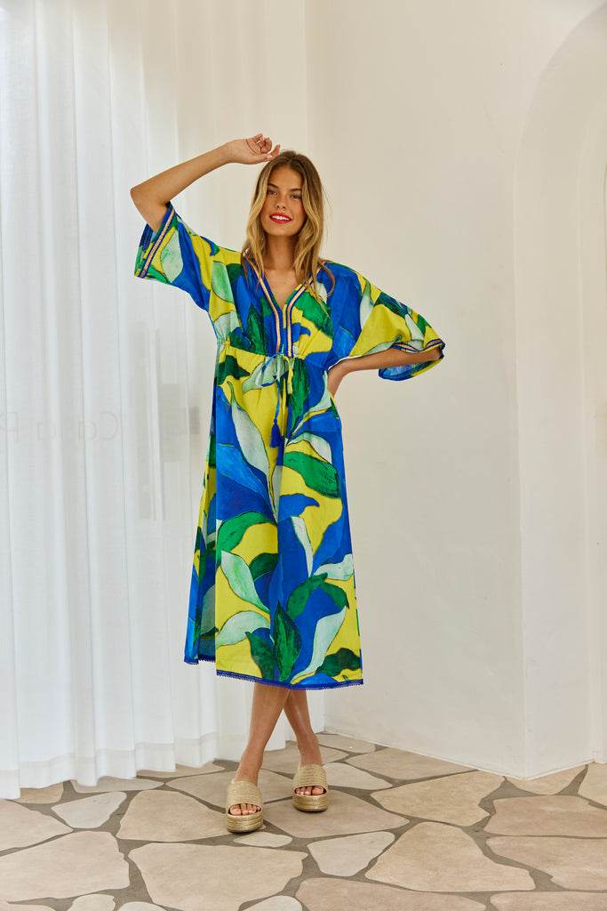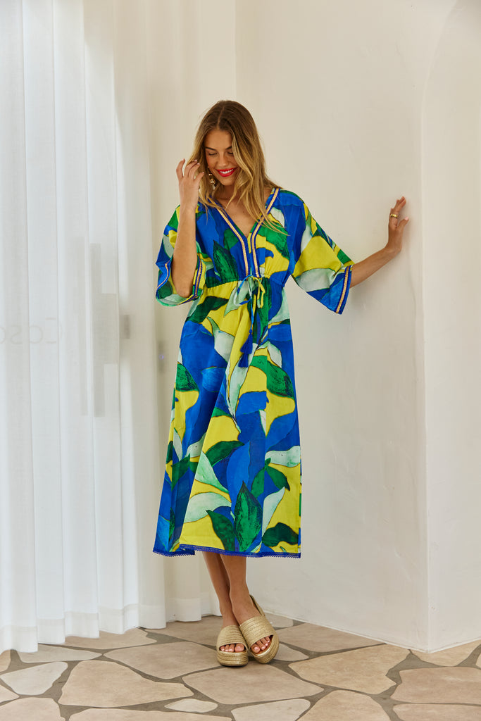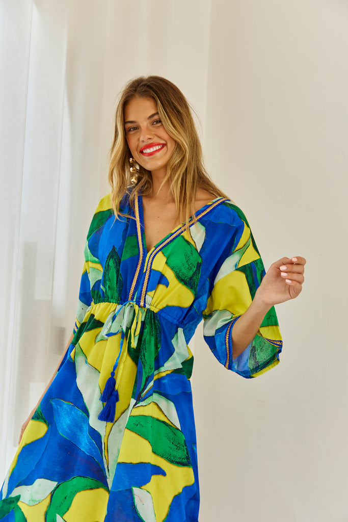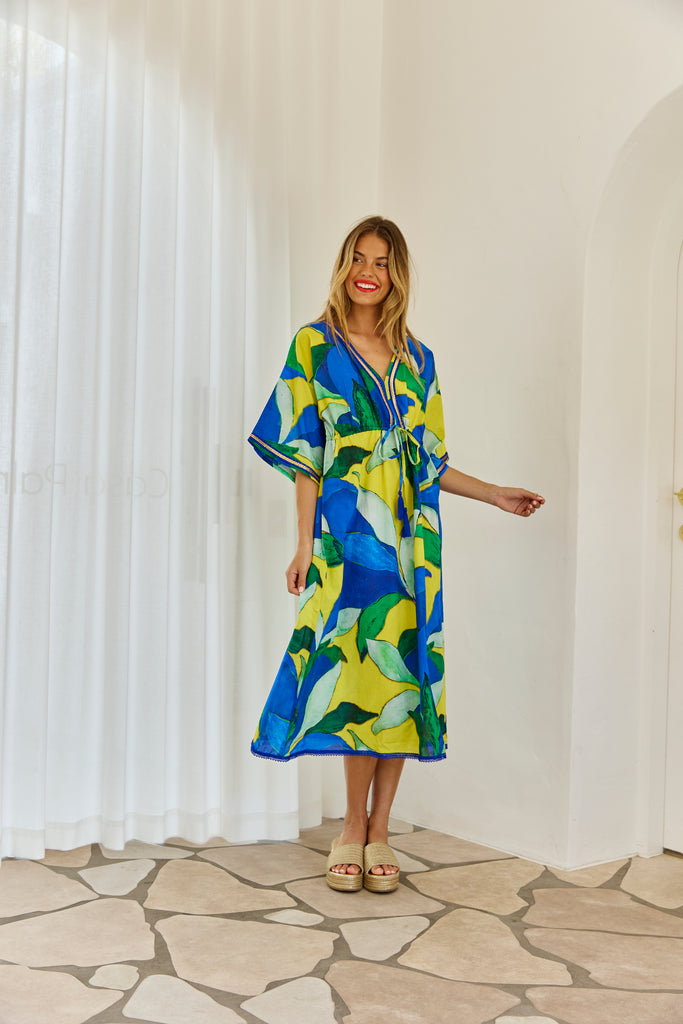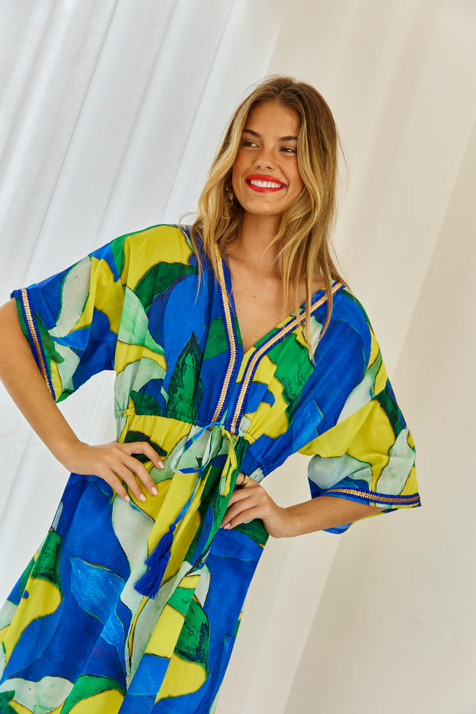 Our Rio Dress in Dioris Print is a celebration of bold colour and dynamic abstract patterns that harmoniously blend creating the allure of a tropical paradise. The flattering v-neckline and wide, relaxed sleeves are accented with striking blue and gold trim, and delicate blue lace details on the lower hemline add some extra charm. Crafted from a luxurious, breathable cotton, this stylish and popular frock ties under the bust and drapes the body beautifully creating a flattering silhouette for all.